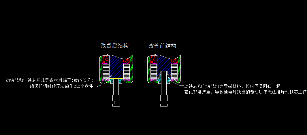 上面是保持式電磁鐵的基本原理,其中動鐵芯需要和鐵芯以及蓋板長時間的接觸(保持時候),動鐵芯和鐵芯都是導磁材料,在通電情況下或者不通電情況下都會被磁化,要讓動鐵芯順暢工作,產(chǎn)生的作用力一定要大于磁化和磁鐵的磁力