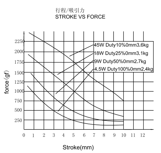 圖解:1,上圖描述的是推拉式電磁鐵的行程和力量曲線圖