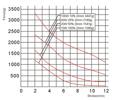 圖解:1,上圖描述電磁鐵的行程和力量曲線圖,橫向代表行程(mm),縱向代表力量(g)。